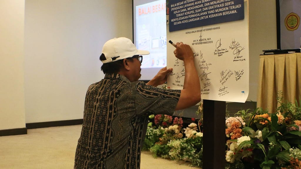 Sebagai penutup, kegiatan Forum Konsultasi Publik diakhiri dengan penandatanganan Komitmen Bersama antara BBV Maros dan para pengguna jasa. Komitmen ini menegaskan kesiapan BBV Maros dalam memberikan pelayanan penyidikan, pengamatan, pengujian, dan diagnosis kesehatan hewan serta keamanan produk hewan, sekaligus memperkuat kerja sama dengan seluruh pemangku kepentingan.