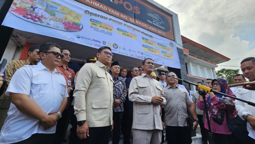 Magelang – Menteri Pertanian (Mentan), Andi Amran Sulaiman bersama Wakil Menteri Pertanian (Wamentan), Sudaryono melakukan pemantauan langsung terhadap Operasi Pasar Pangan Murah yang digelar di Kantor Pos Kota Magelang, Jawa Tengah, pada Selasa (25/2/2025). Kegiatan yang dihadiri oleh Wakil Walikota Magelang, Direktur Pengadaan Bulog, Direktur Bisnis Bulog, EVP Reg IV PT Pos Indonesia serta jajaran pejabat lainnya, bertujuan untuk memastikan kelancaran distribusi bahan pangan dengan harga terjangkau menjelang bulan suci Ramadan.