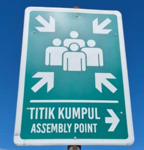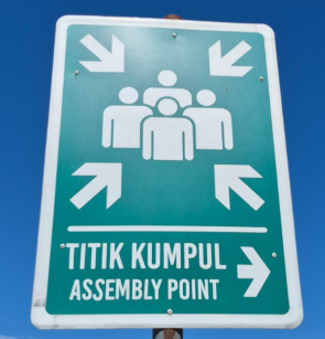 Setibanya di luar gedung, berkumpulah di area yang ditandai dengan tanda “Titik Kumpul”. Area ini telah ditetapkan sebagai lokasi aman sementara menunggu instruksi lebih lanjut dari petugas.
