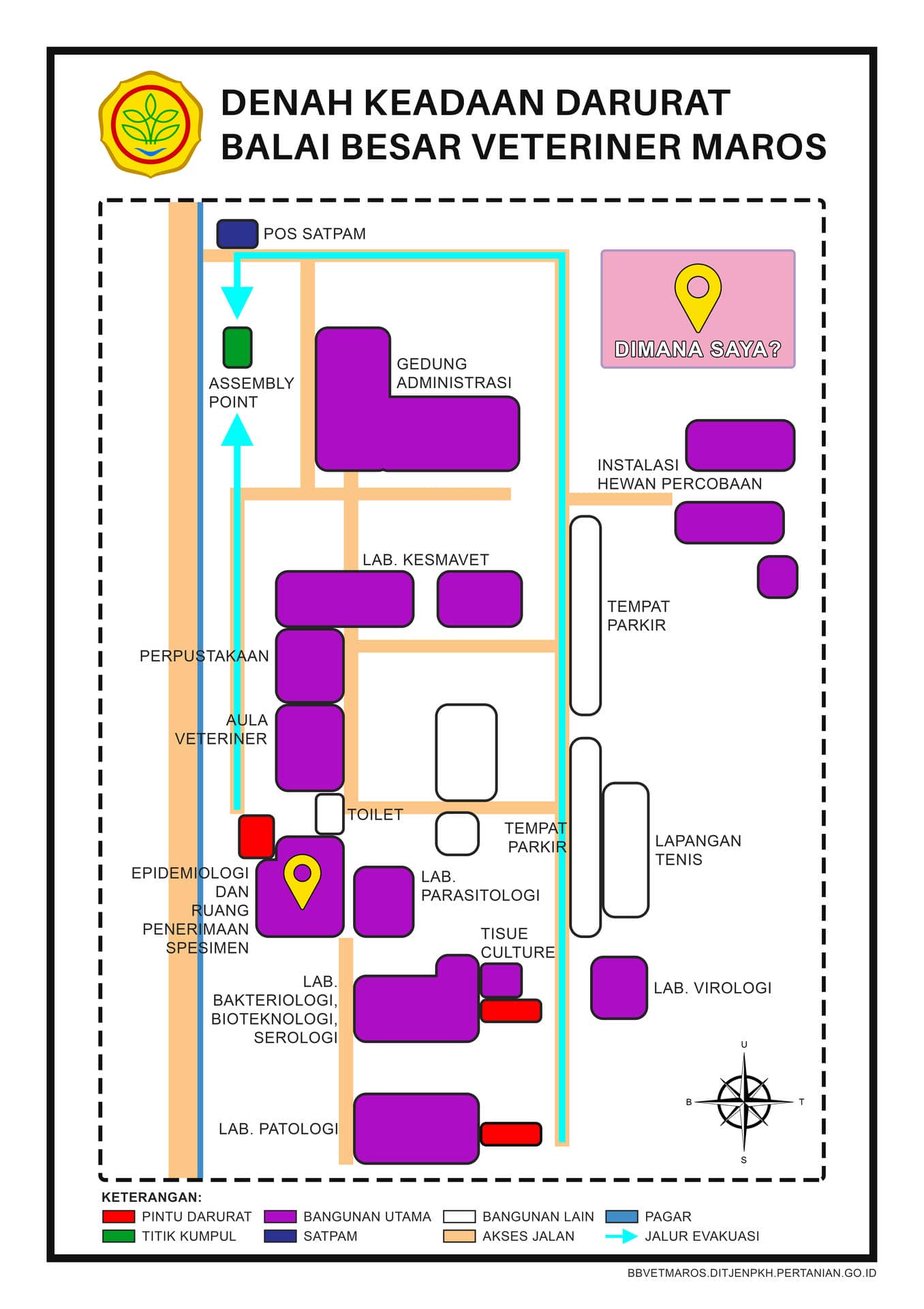 Apabila terjadi keadaan darurat, seluruh pegawai dan tamu di lingkungan Balai Besar Veteriner Maros diwajibkan mengikuti prosedur evakuasi dengan tertib. Tetaplah tenang dan segera perhatikan informasi atau arahan yang diberikan melalui sistem peringatan maupun petugas keamanan. Pastikan Anda mengetahui posisi Anda berada saat ini dengan melihat poster denah keadaan darurat yang telah dipasang di setiap ruangan.