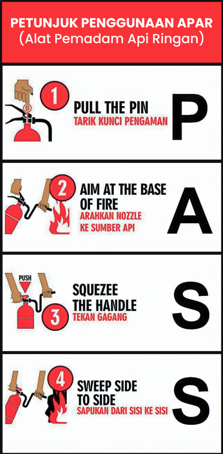 Apabila Anda menemukan area atau benda yang terbakar di lingkungan Balai Besar Veteriner Maros, tetaplah tenang dan segera ambil tindakan cepat. Cari Alat Pemadam Api Ringan (APAR) terdekat yang telah disediakan di setiap koridor dan titik strategis gedung. Gunakan APAR dengan mengikuti teknik PASS agar pemadaman lebih efektif: Pull – tarik kunci pengaman, Aim – arahkan nozzle tepat ke sumber api, Squeeze – tekan gagang untuk menyemprotkan bahan pemadam, dan Sweep – sapukan semburan dari sisi ke sisi hingga api padam.