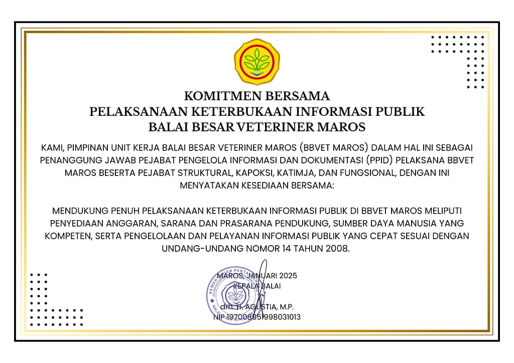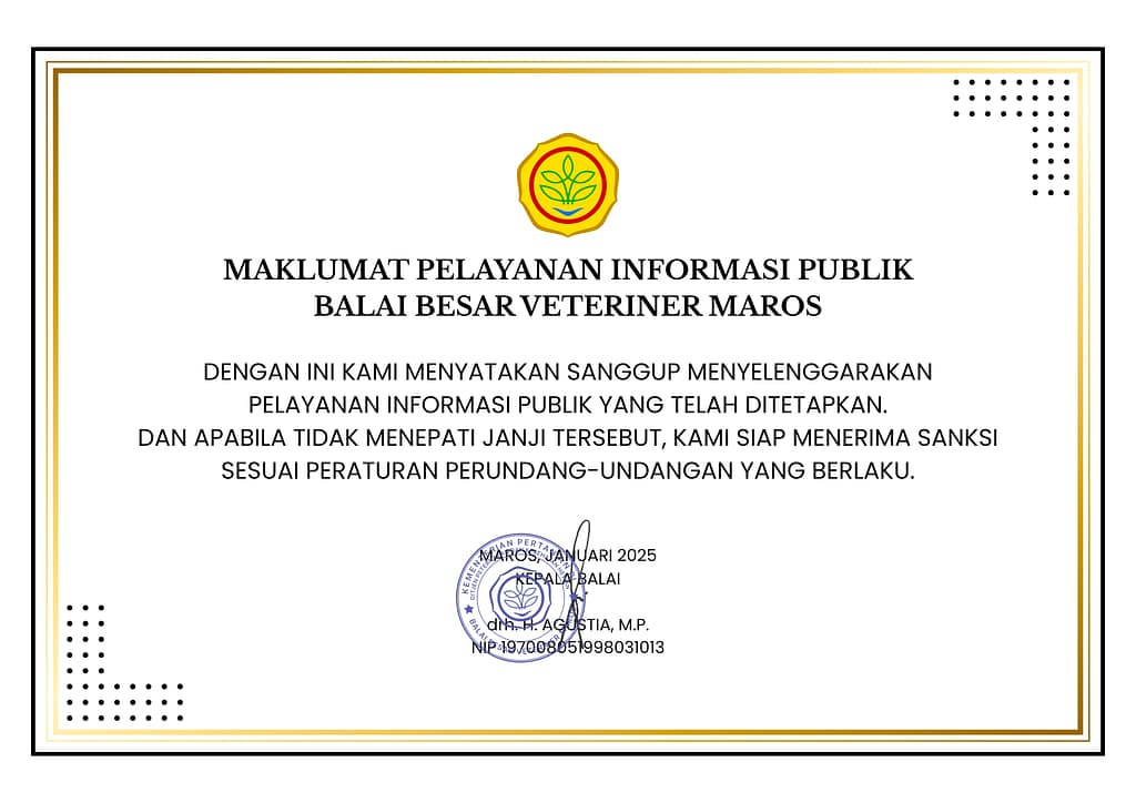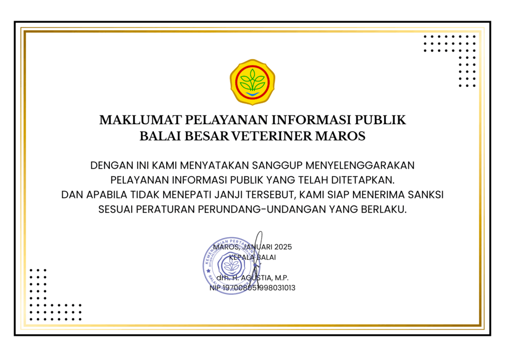 Untuk dapat mengakses layanan PPID Balai Besar Veteriner Maros, silakan kunjungi Portal PPID Balai Besar Veteriner Maros