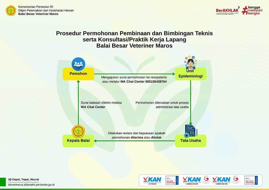 Selamat datang di halaman informasi standar pelayanan publik di Balai Besar Veteriner Maros (BBVet Maros). Kami berkomitmen untuk menyediakan layanan pengujian veteriner yang cepat, akurat, dan efisien. Berikut adalah Standar Pelayanan Publik BBVet Maros Tahun 2025: