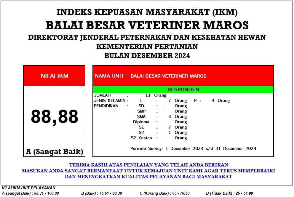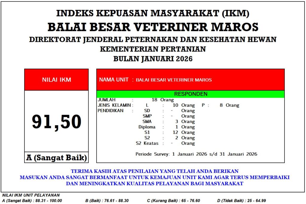 Di Balai Besar Veteriner Maros (BBVet Maros), kami berkomitmen untuk memberikan pelayanan publik yang terbaik dan terus-menerus meningkatkan kualitas layanan kami. Salah satu cara untuk mencapai tujuan tersebut adalah dengan mendengar langsung dari Anda, masyarakat yang kami layani.