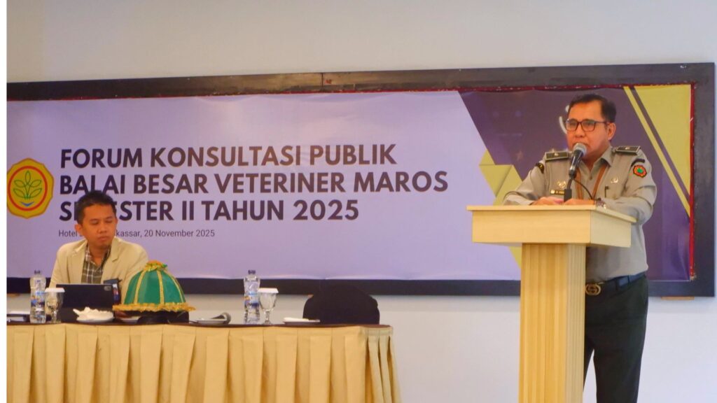 Makassar, 20 November 2025 — Balai Besar Veteriner Maros (BBV Maros) kembali menyelenggarakan Forum Konsultasi Publik (FKP) Semester II Tahun 2025 sebagai bentuk komitmen berkelanjutan dalam meningkatkan kualitas pelayanan publik. Kegiatan ini menjadi ruang dialog terbuka antara penyelenggara layanan dan para pengguna jasa guna mewujudkan pelayanan yang transparan, responsif, dan akuntabel.
