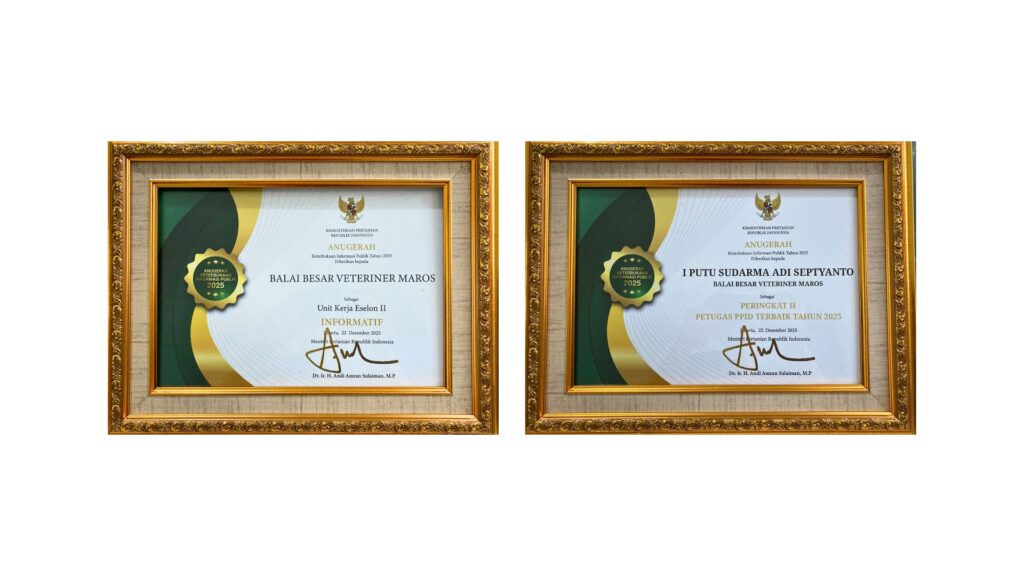 Jakarta, 22 Desember 2025 — Balai Besar Veteriner Maros kembali menorehkan prestasi dalam Anugerah Keterbukaan Informasi Publik (KIP) lingkup Kementerian Pertanian Republik Indonesia. Pada ajang yang digelar bersamaan dengan Rapat Koordinasi Kehumasan dan Anugerah KIP 2025 di Kantor Pusat Kementerian Pertanian, BBV Maros meraih predikat “Informatif” dalam pelaksanaan keterbukaan informasi publik dan berhasil membawa pulang peringkat kedua sebagai Petugas PPID (Pejabat Pengelola Informasi dan Dokumentasi) terbaik se-Kementerian Pertanian.